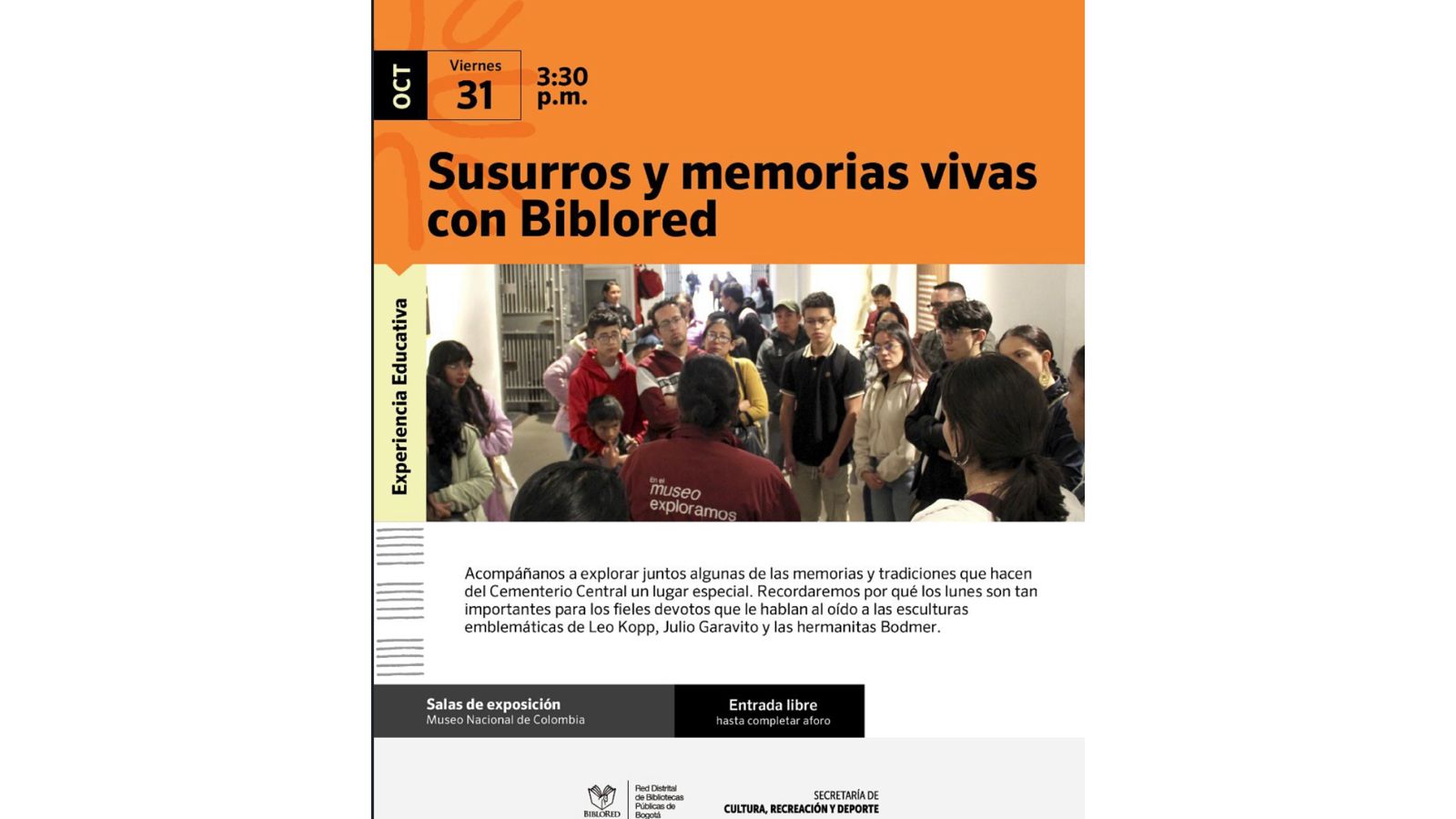 El Museo Nacional realizará a las 3:30 p. m. la actividad 'Susurros y memorias vivas', un acercamiento a las tradiciones que rodean el Cementerio Central. Y el Teatro Jorge Eliécer Gaitán presentará la obra “El espectro del doctor Russi: memorias de terror en La Candelaria”, con boletería, a las 7:00 p. m.